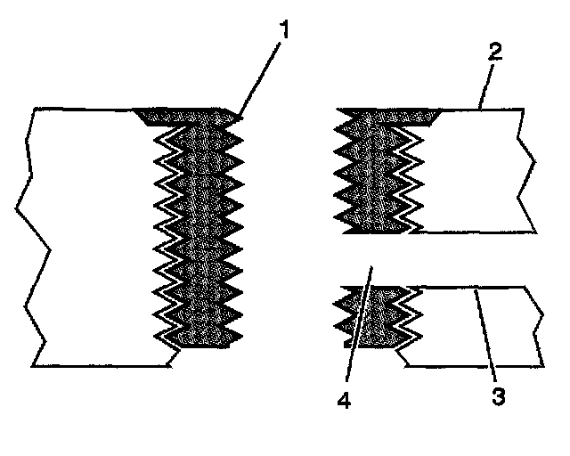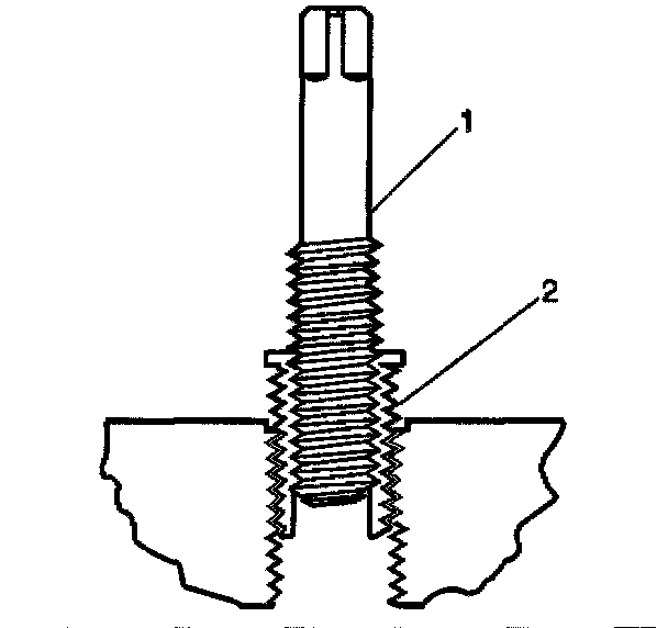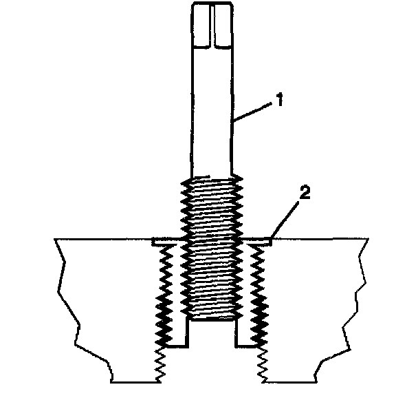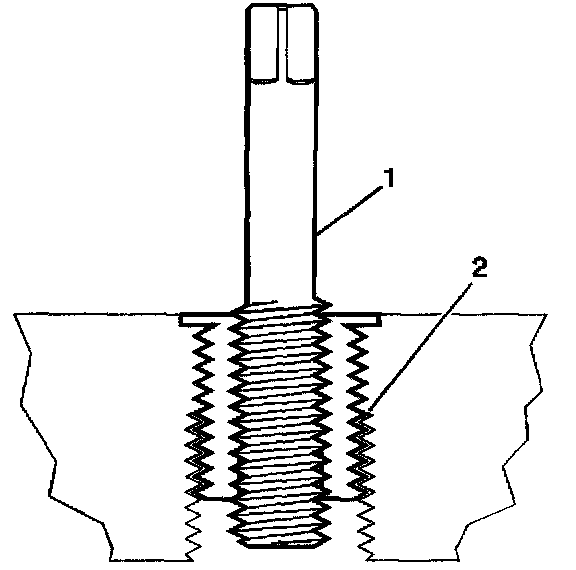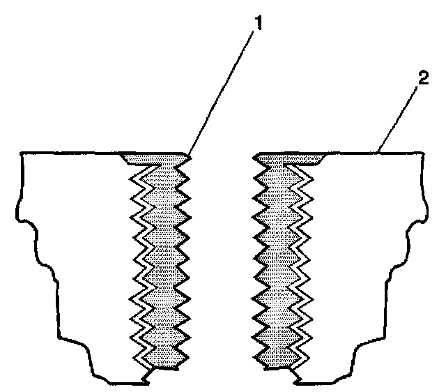 15. Inspect the insert for proper installation into the tapped hole. A properly installed insert (1) will be either flush or slightly below flush with the surface of the base material (2).