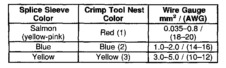 4. Select the proper sealed splice sleeve according to the wire size. Refer to the above table at the beginning of the repair procedure for the color coding of the splice sleeves and the crimp tool nests.