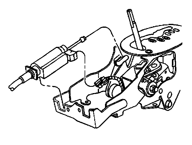 6. Slip a flat head screwdriver blade into the slot provided in the ignition switch inhibitor. Depress the able latch and pull the park lock cable from the inhibitor.