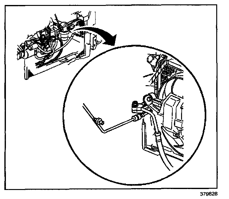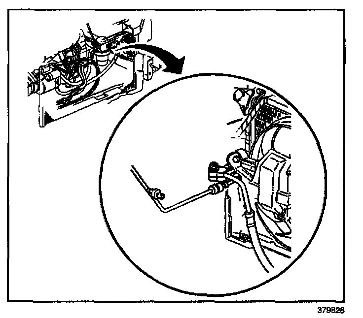 7. Remove the A/C compressor hose block fitting nut from the condenser.