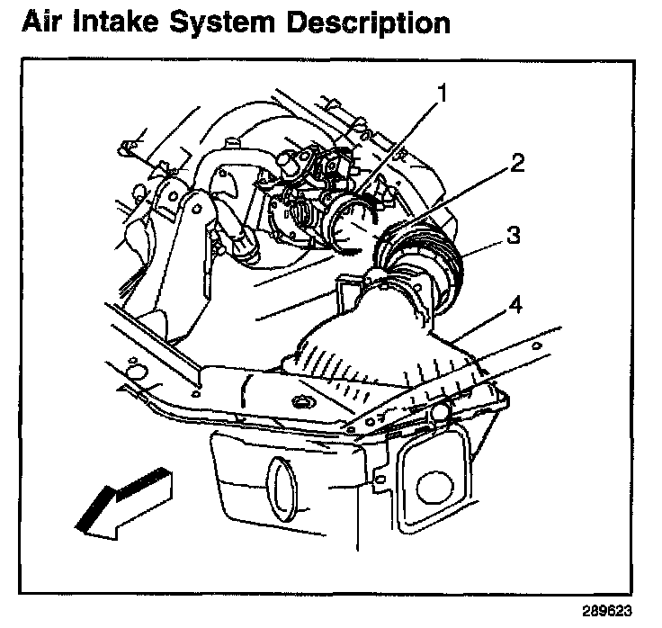 The air induction system provides contaminant and sound filtration of the outside air as the air is drawn into the engine. A remotely mounted air cleaner prevents contaminants in the air from entering the engine. The air cleaner assembly (4) also acts as a resonator to reduce any air induction noise. The filtered air then enters the engine by flowing through the intake air duct (3), the throttle body (1), into the intake manifold, through the cylinder head intake ports, and finally into the cylinders.
