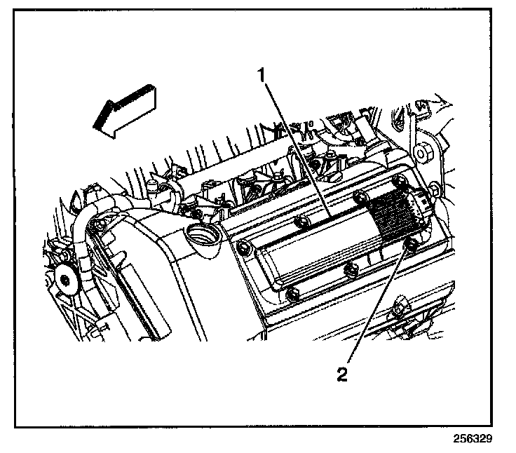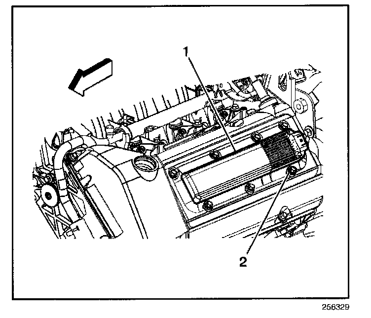 ^ Ensure that the ignition cassette-to-cam cover ground spring (2) is in place.