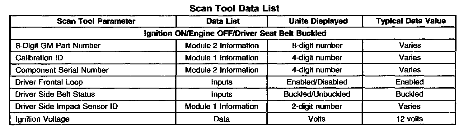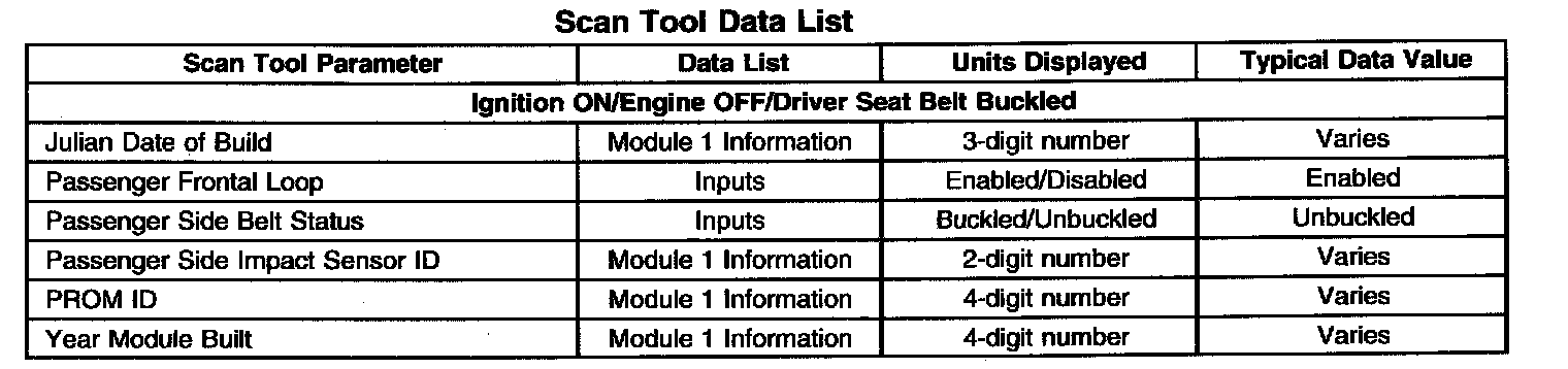 The SIR scan tool data list contains all the restraint system related parameters that are available on the scan tool. The parameters in the list are arranged in alphabetical order. The column, "Data List," indicates the location of the parameter within the scan tool menu selections.