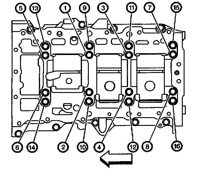 Tighten the lower crankcase bolts (1 through 16) in proper sequence.