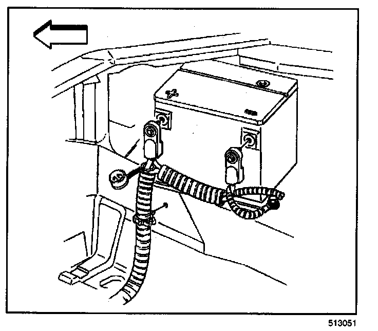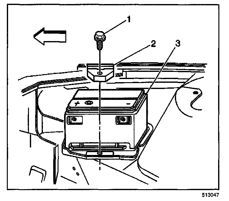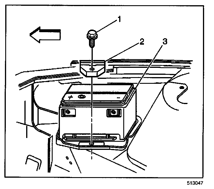 4. Remove the battery hold down retainer bolt (1).