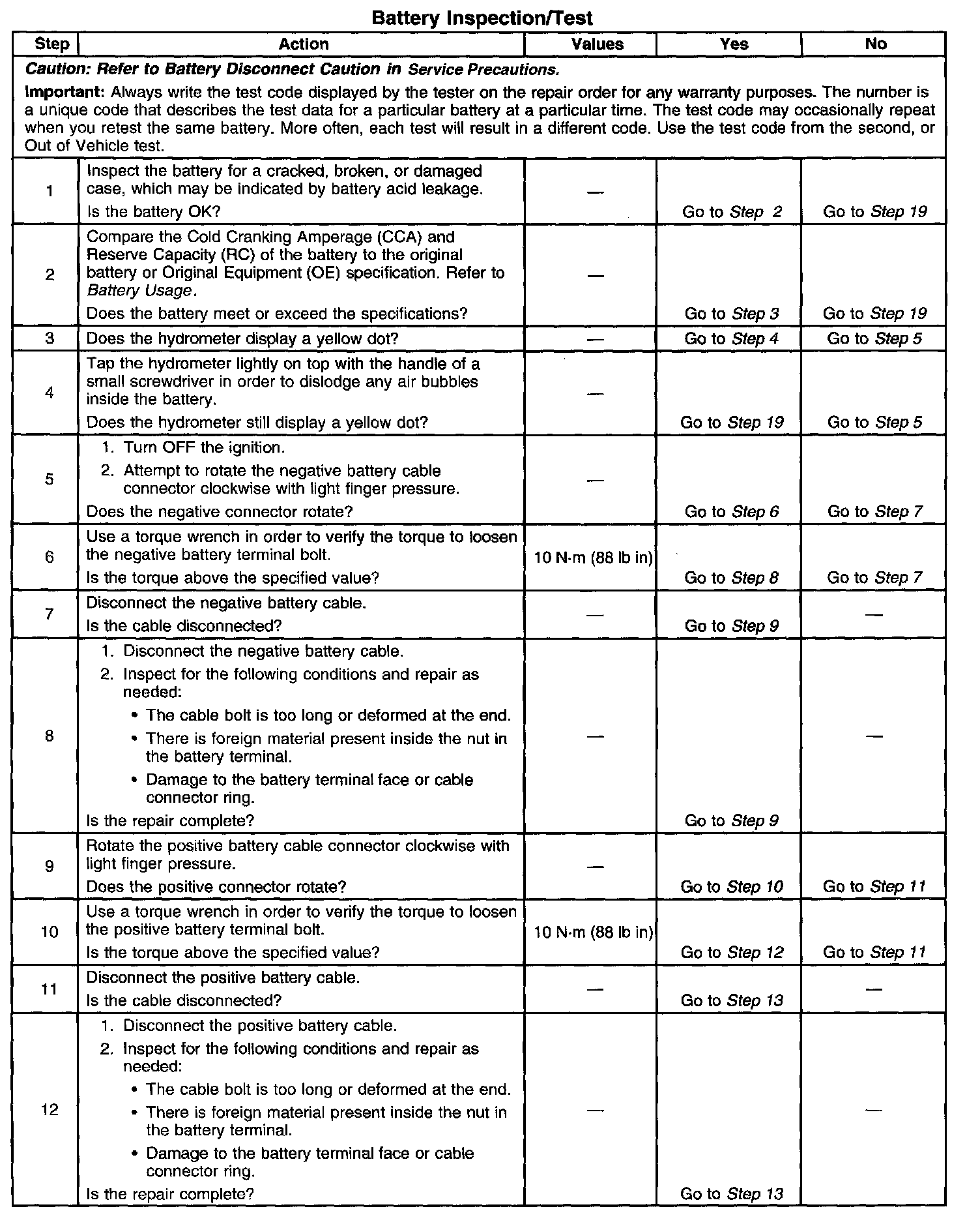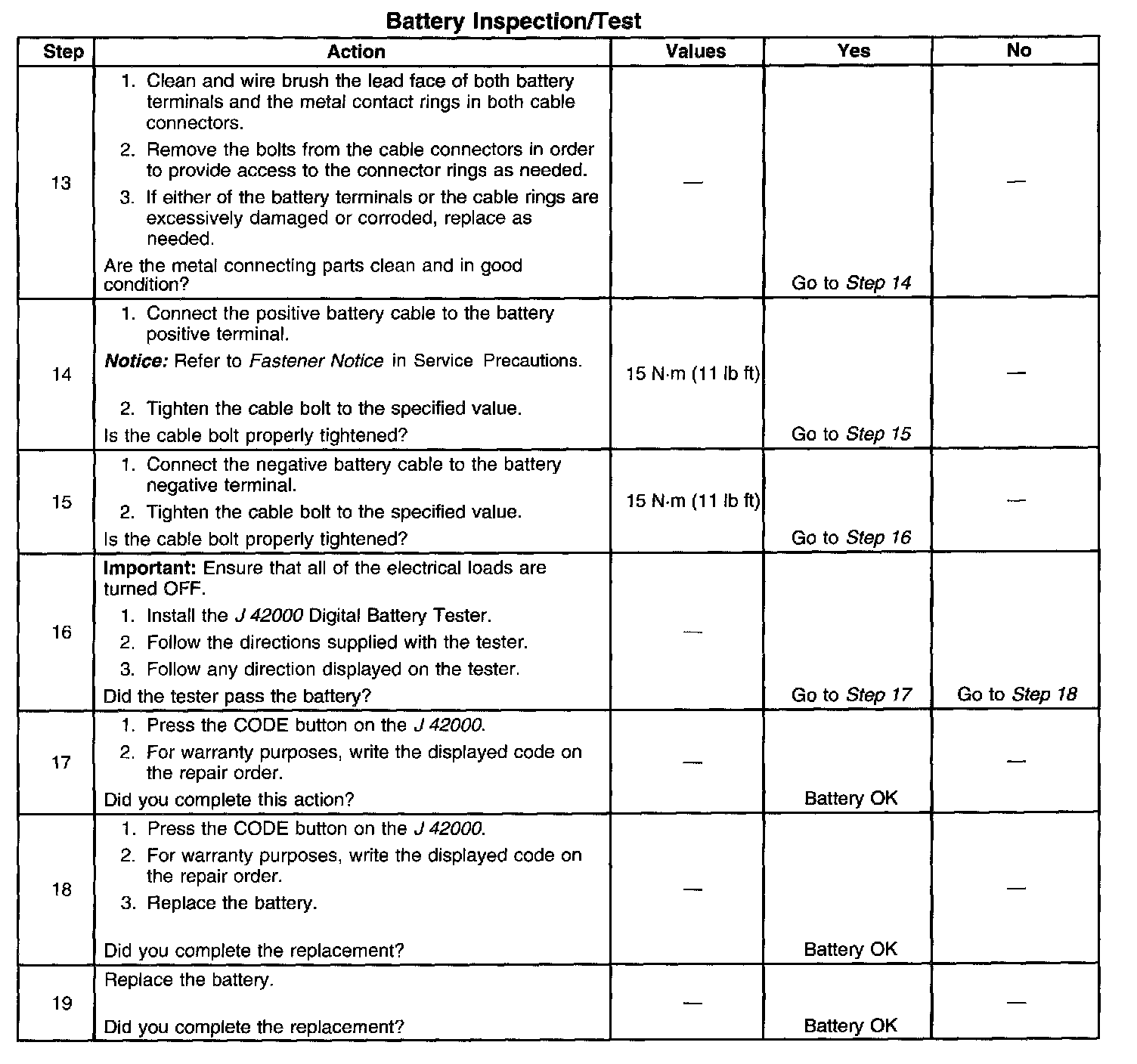 - If the tester displays a REPLACE BATTERY or BAD CELL-REPLACE result for a battery tested in the vehicle with the battery cables connected, perform the following steps: