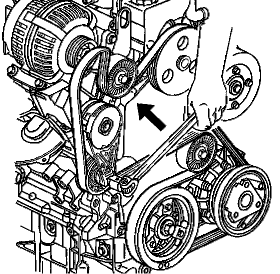 Notice: Routine inspection of the belt may reveal cracks in the belt ribs. These cracks will not impair the belt performance. The belt should be replaced if the belt slip occurs if a section of the belt ribs are missing. A single serpentine drive belt is used to drive all engine accessories. All belt driven accessories are rigidly mounted with the belt tension maintained by a spring loaded tensioner. The indicator on the movable portion of the tensioner must be within the limits of the marks of the stationary portion of the tensioner. Any reading outside of these limits indicates either a defective belt or tensioner.