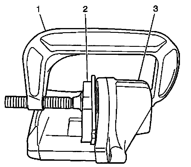 11. Install a large C-clamp (1) over the body of the brake caliper (3) with the C-clamp ends against the rear of the caliper body and against an old inner brake pad or a wood block (2) installed against the caliper piston.