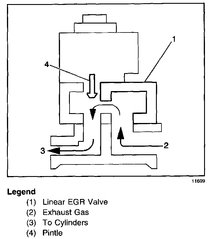 The EGR valve is designed to supply EGR to the engine. The EGR valve consists of a sealed bobbin and coil assembly, or solenoid. Inside the solenoid is a sleeve-armature assembly that contains a pintle and valve, two seals, retaining washers, a seal spring, and armature spring, and a bearing. The bearing seals the pintle valve shaft from the exhaust chamber. Also, a shield, held in place by a compression spring, deflects exhaust gas from the shaft and armature.