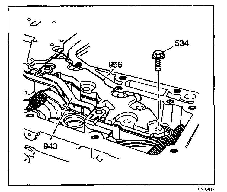 6. Hand start the bolts (534) to hold the oil transfer plate (956) in place with the lower control valve body wire harness retaining clips (943) attached properly.