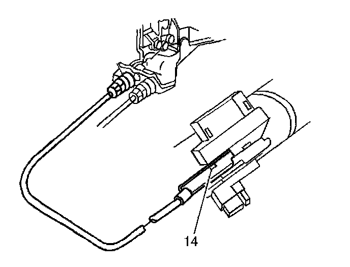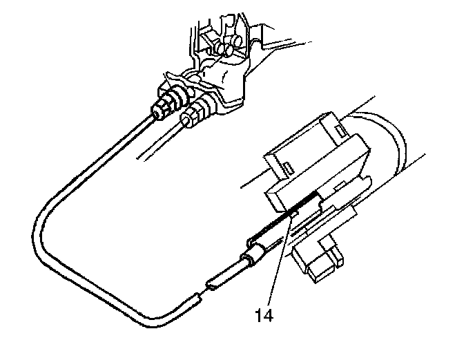 6. Slip a flat head screwdriver blade into the slot provided (14) in the ignition switch inhibitor. Depress the cable latch and pull the park lock cable from the inhibitor.