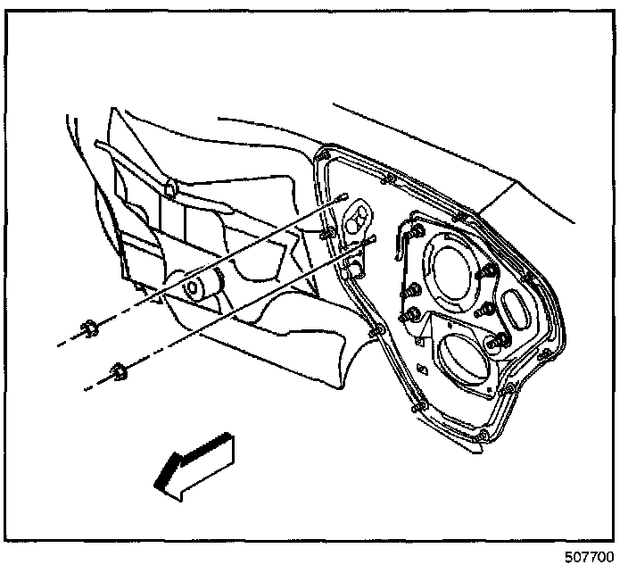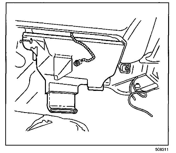 IMPORTANT: Position the heater core cover downward and rearward in order to disconnect the cover from the rear area floor duct assembly.