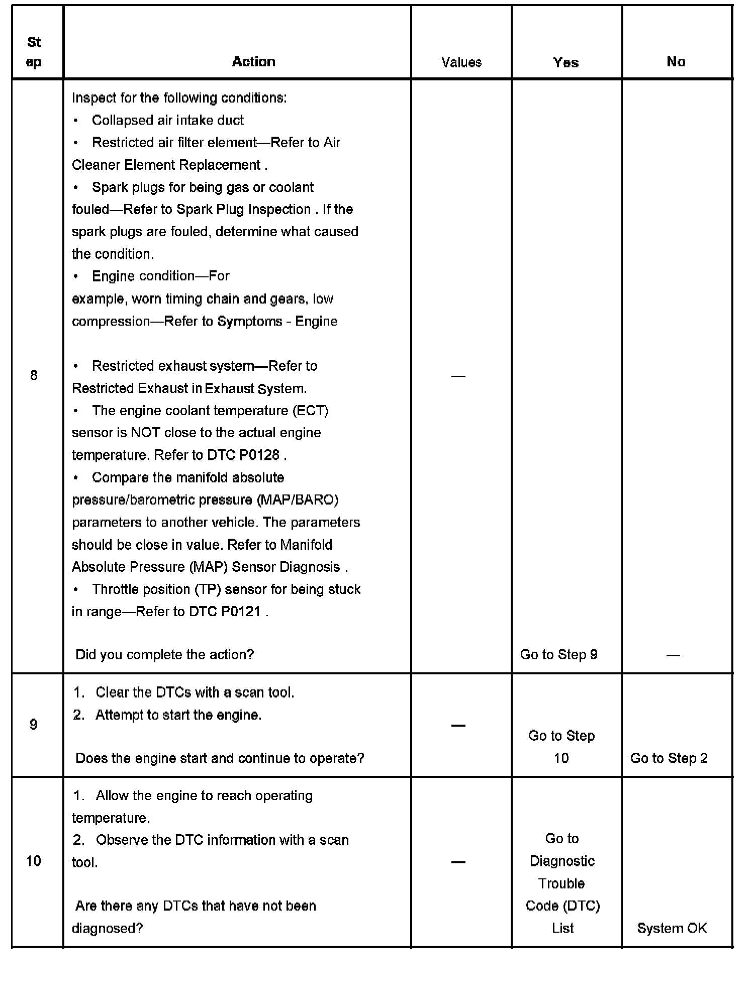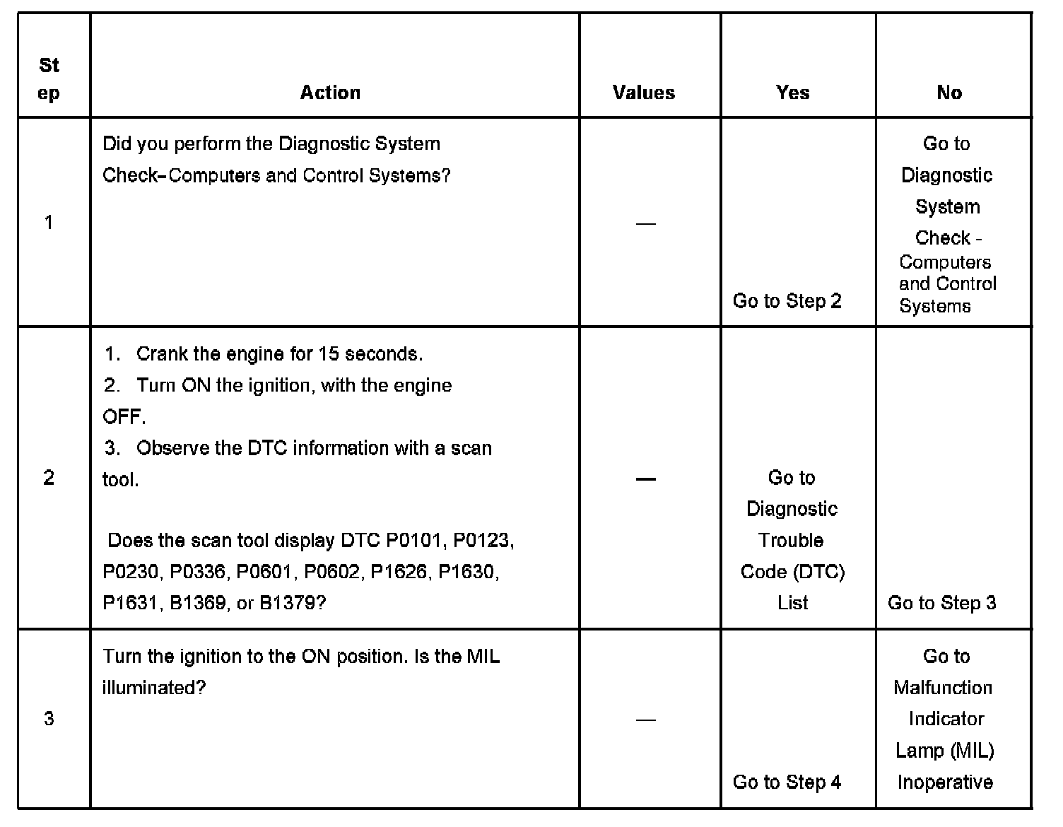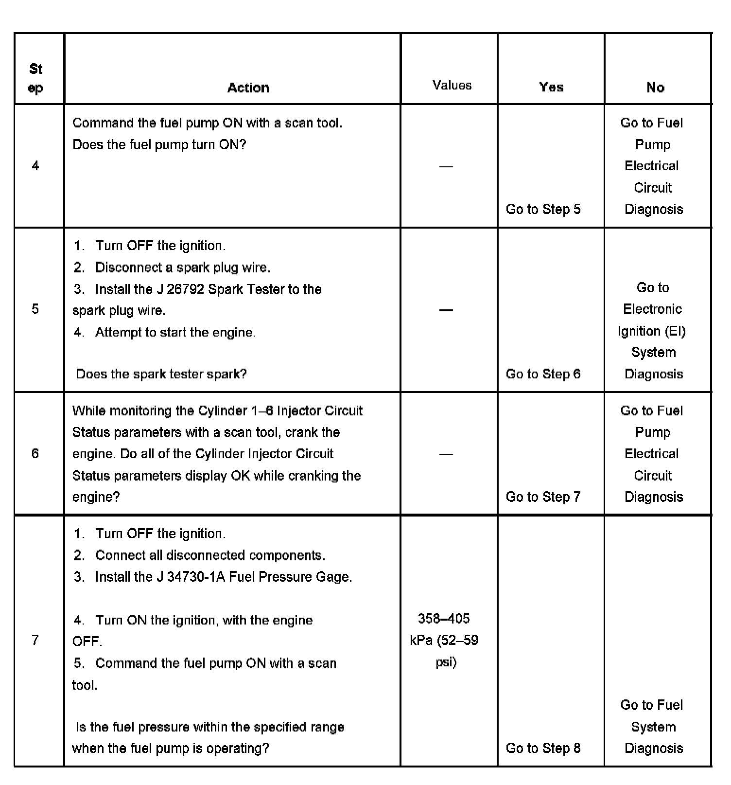DESCRIPTIONThe Engine Cranks but Does Not Run diagnostic table is an organized approach to identifying a condition that prevents an engine from starting. The Engine Cranks but Does Not Run diagnostic table directs the service technician to the appropriate system diagnosis.
