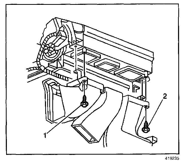10. Remove the air distributor duct screws (1, 2). Due to the difficulty in the removal of the right side screw (2), it will not be necessary to install upon reassembly.