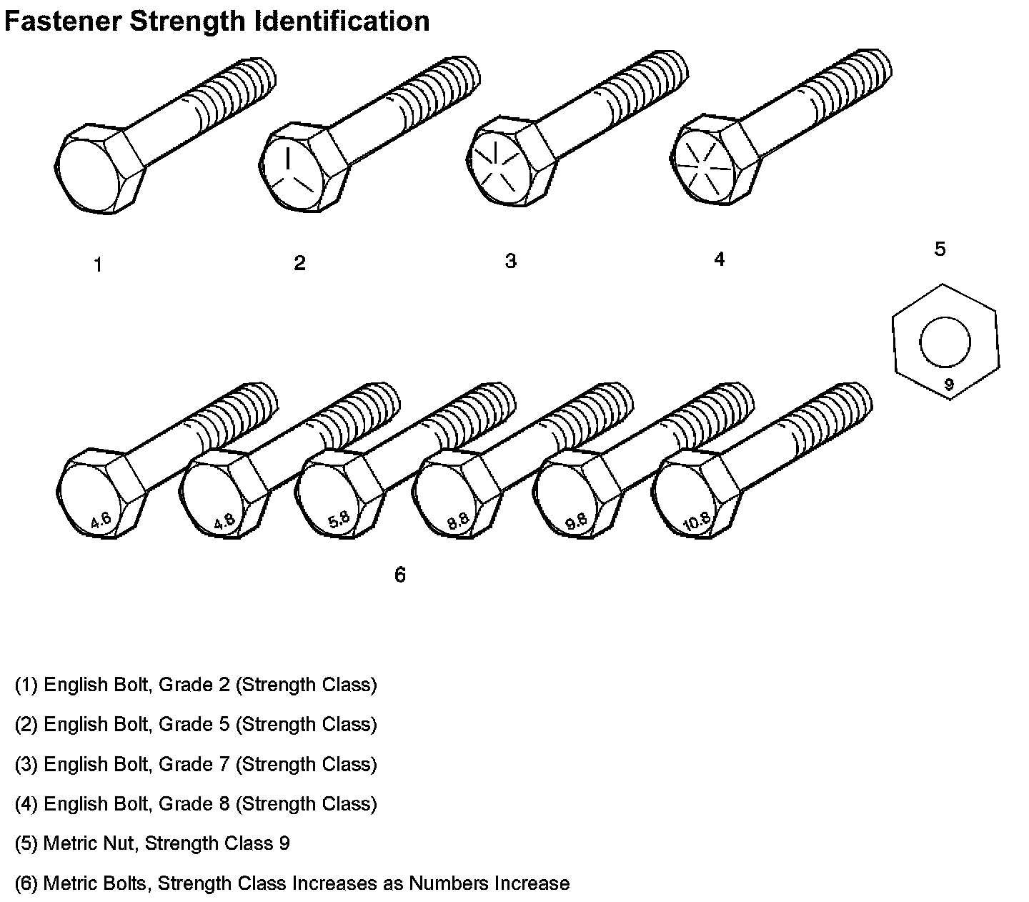 The most commonly used metric fastener strength property classes are 9.8 and 10.9. The class identification is embossed on the head of each bolt. The English, inch strength classes range from grade 2 to grade 8. Radial lines are embossed on the head of each bolt in order to identify the strength class. The number of lines on the head of the bolt is 2 lines less than the actual grade. For example, a grade 8 bolt will have 6 radial lines on the bolt head. Some metric nuts are marked with a single digit strength identification number on the nut face.