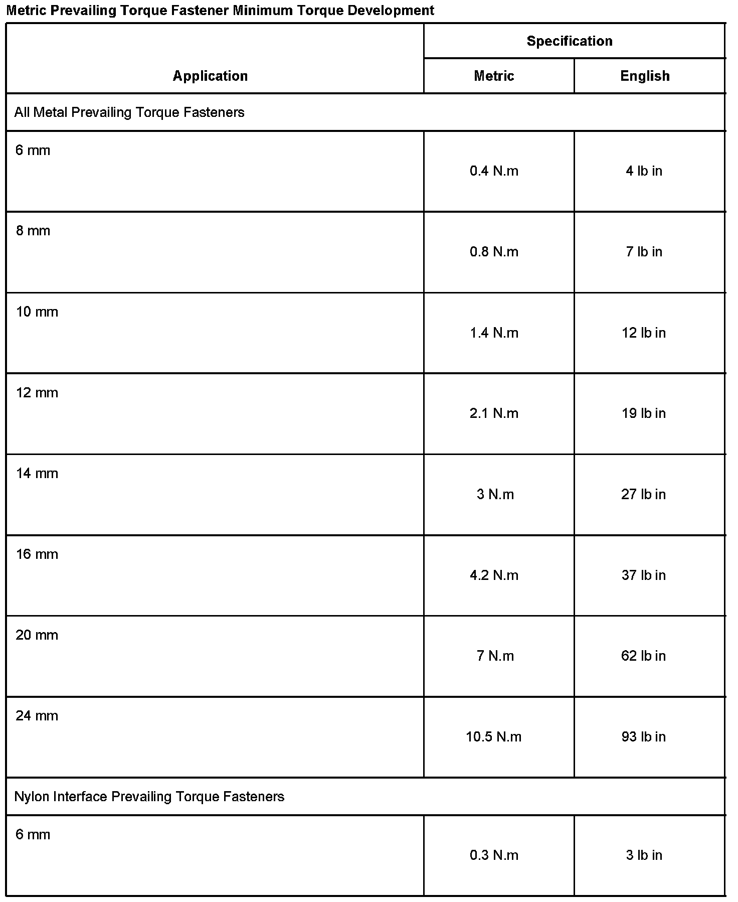 English Prevailing Torque Fastener Minimum Torque Development Part 1: