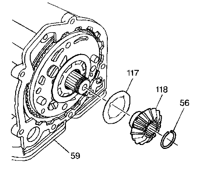 5. Remove the left side differential gear (118). Remove the thrust washer (117).