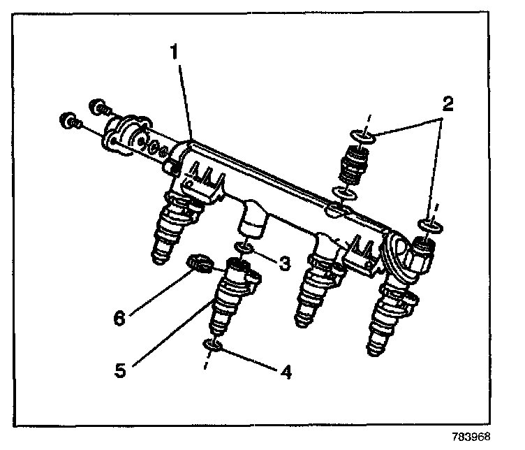 3. Remove the fuel injector (5) from the fuel rail (1).