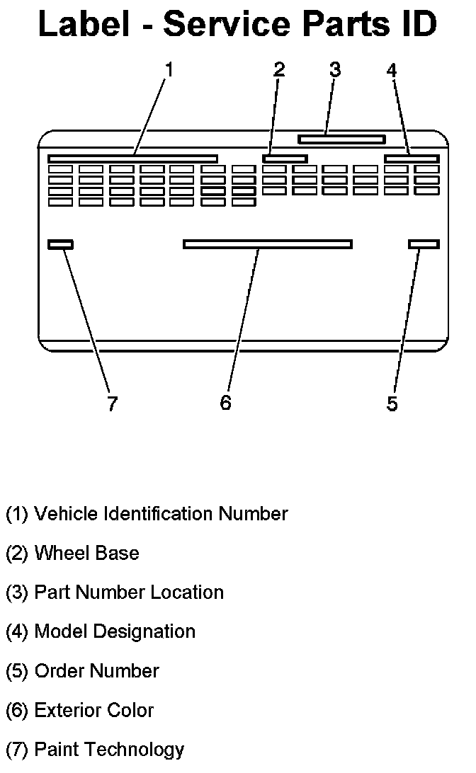 The service parts identification label is placed on the vehicle in order to help the service and parts personnel identify the vehicle's original parts and the vehicle's original options. The label is located on the bottom of the spare tire cover.
