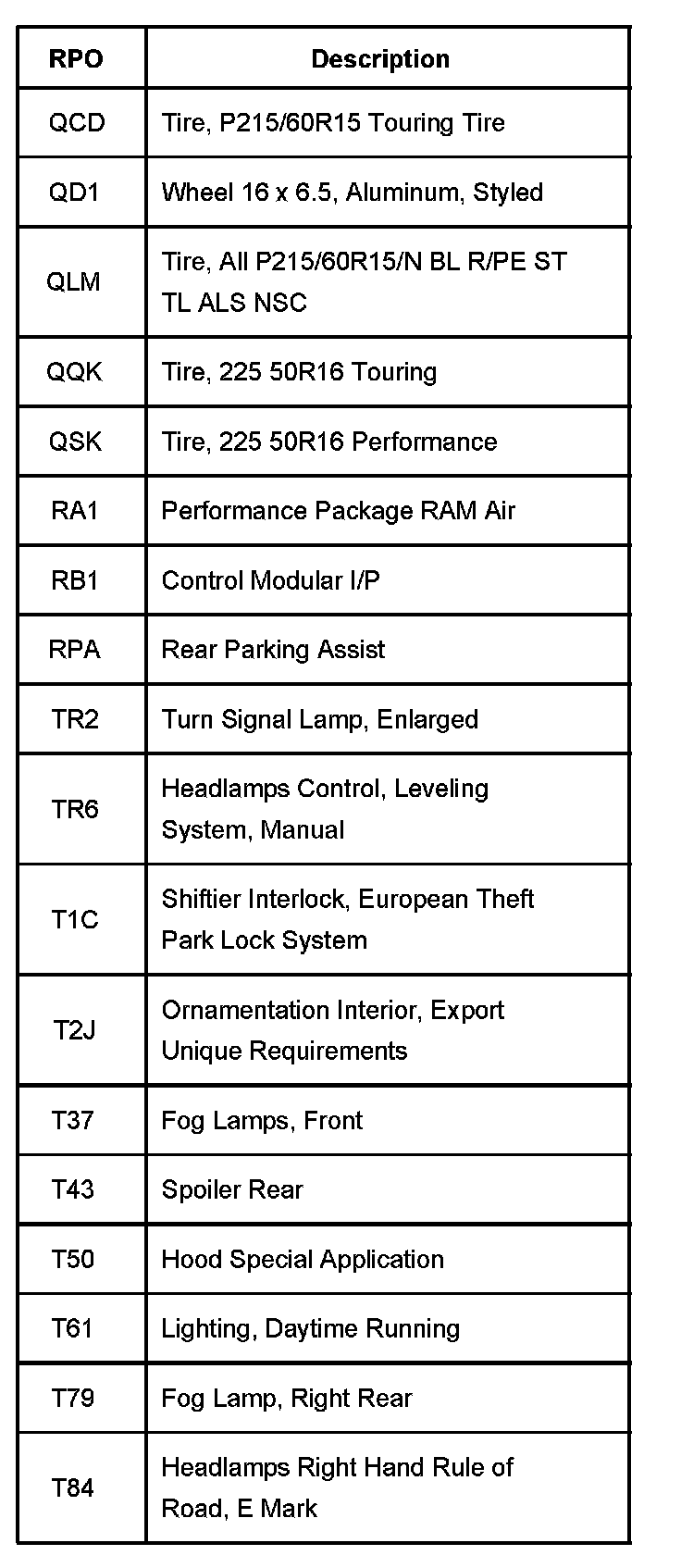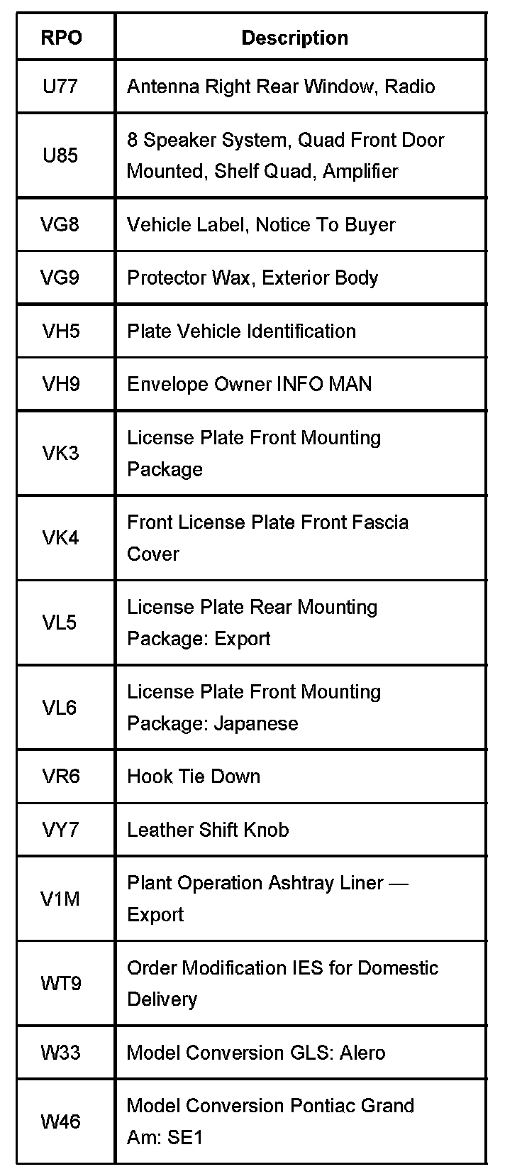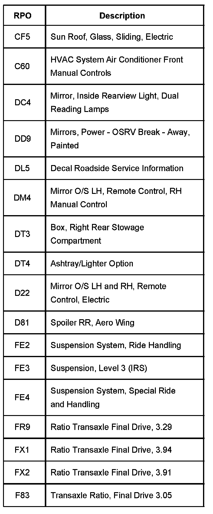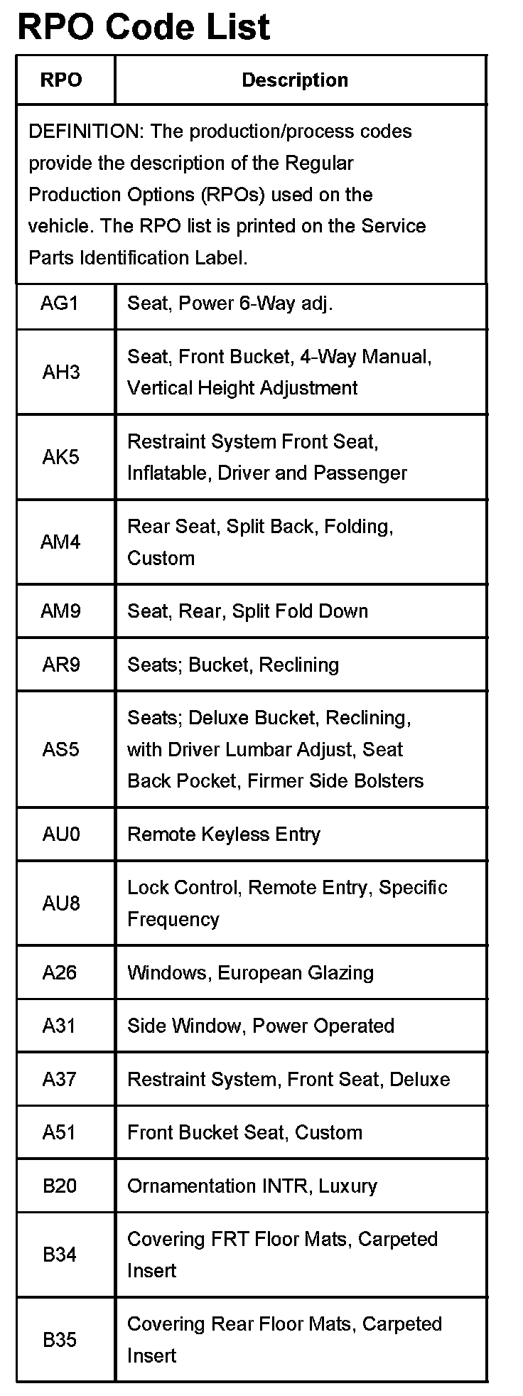 RPO Code List Part 1: