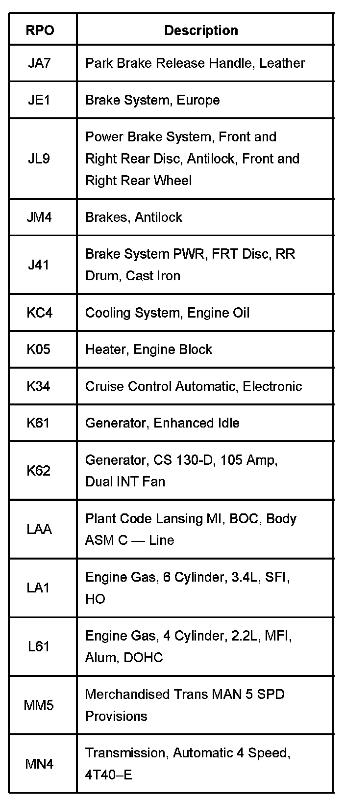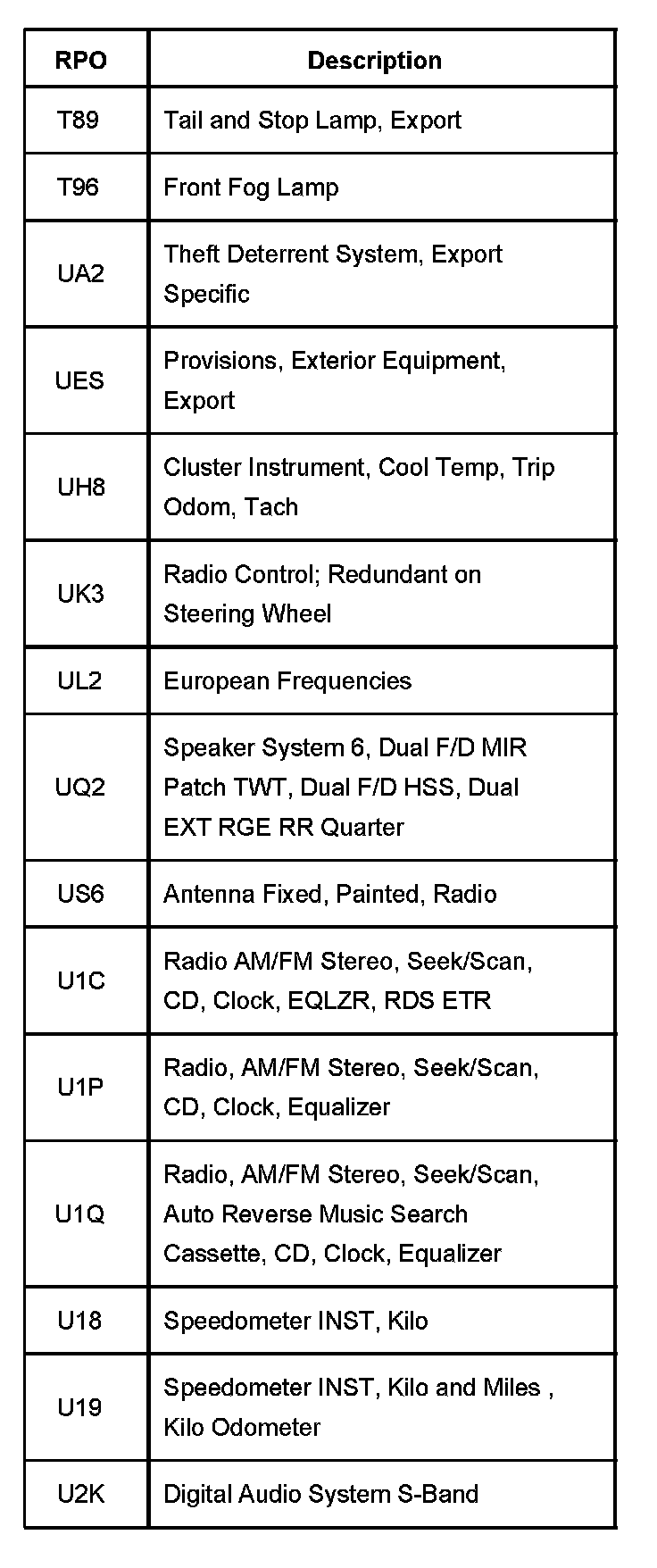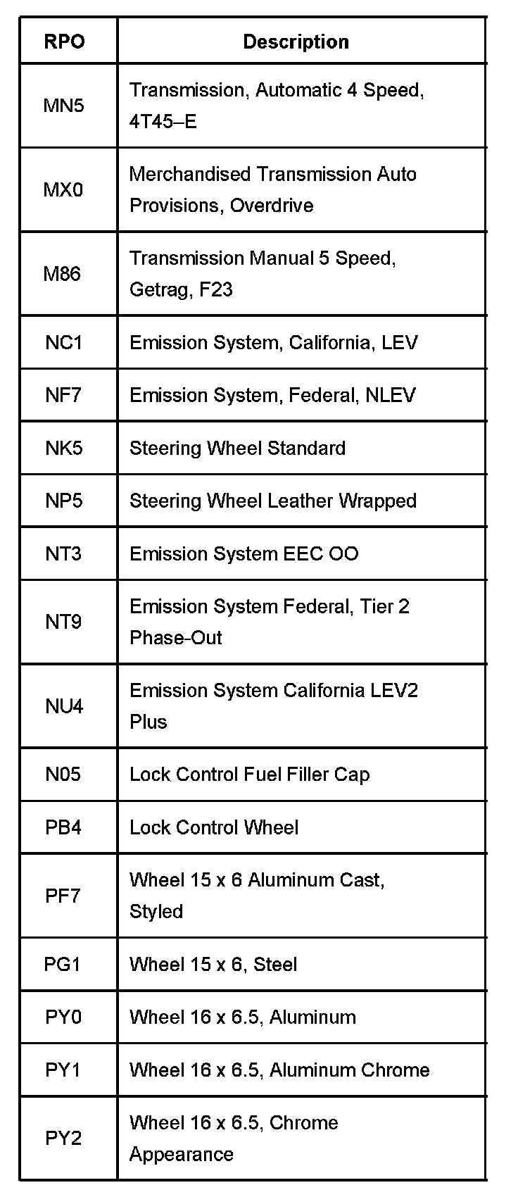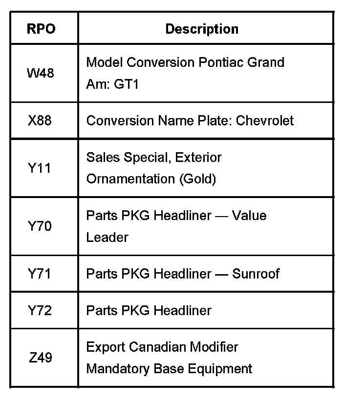 RPO Code List Part 1: