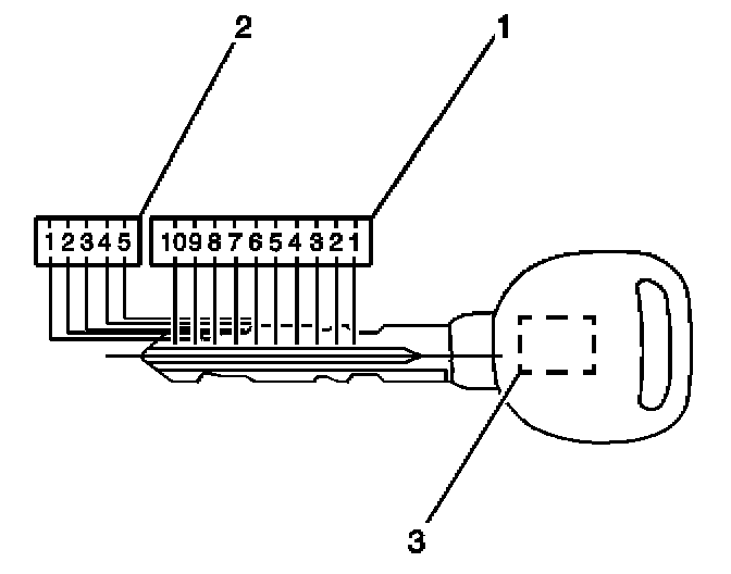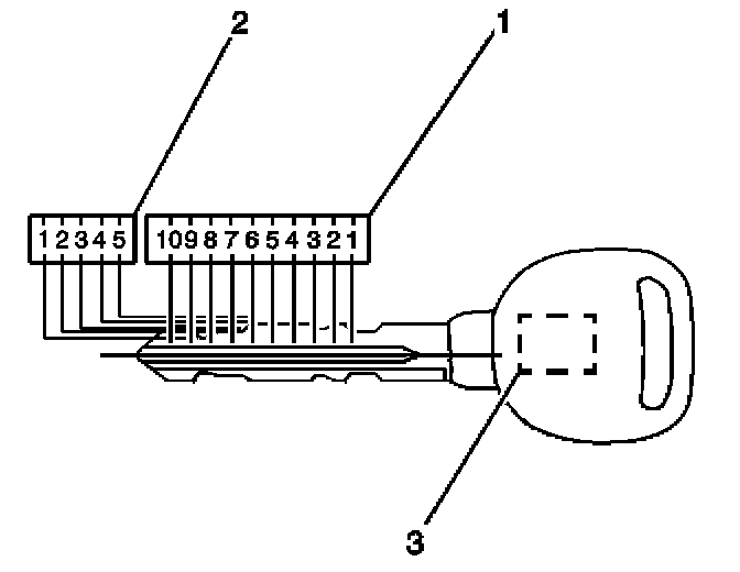 The key code can be obtained from the five-digit number on the key tag that accompanies the original master and valet keys. The five-digit key code cross references to the cut and tumbler sequence. The keys have 10 key cut positions (1) and five key cut depths (2). Key cut positions are numbered 1-10, counting from the head of the key to the tip. The key cut depths are 1-5, cut depth number 1 is the deepest cut. The key transponder (3) in the master and valet key must be programmed to the vehicle.