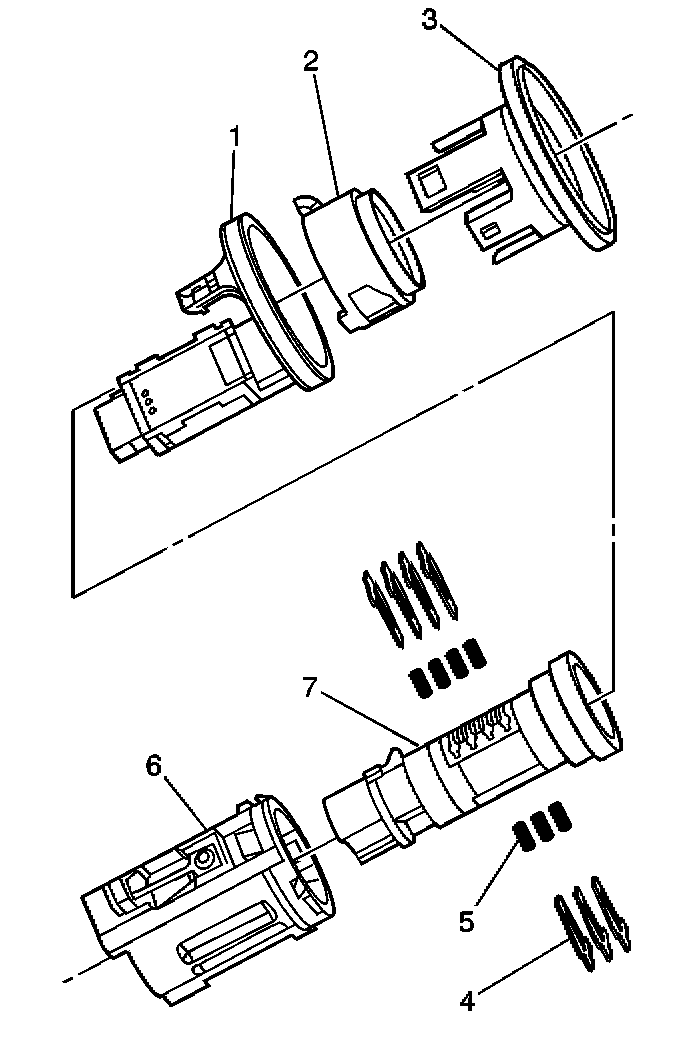 6. Check for correct loading of the tumblers (4) by inserting the key into cylinder (7). All of the tumblers should be flush with the lock cylinder.