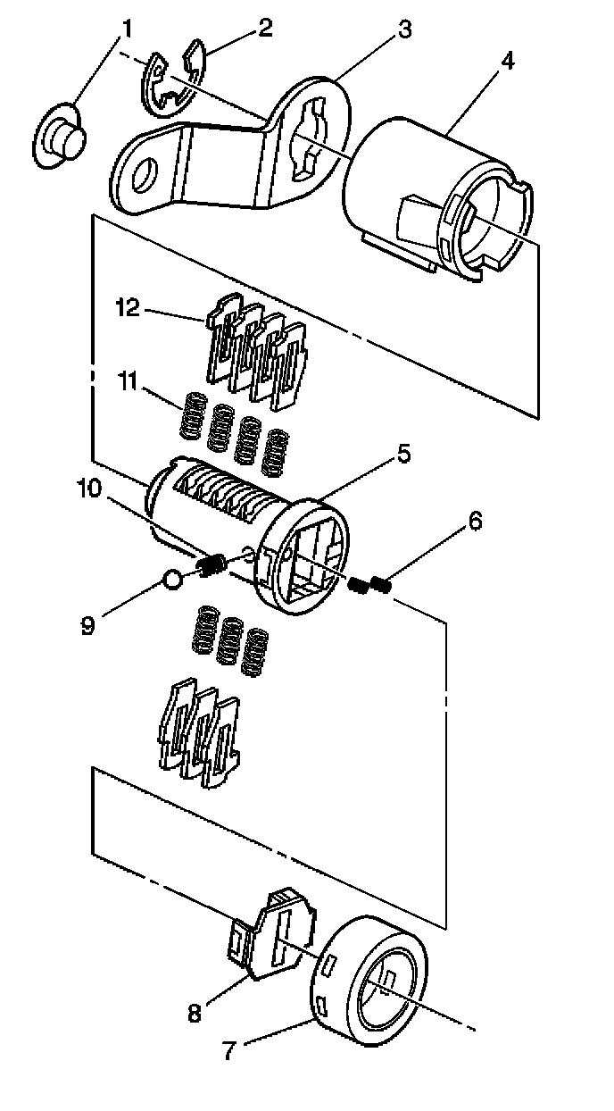 IMPORTANT: The door lock cylinder tumblers are not self-retaining. Hold the tumblers in place when the key is not in the lock cylinder. Hold the lock tumblers (12) in place when performing the next steps.
