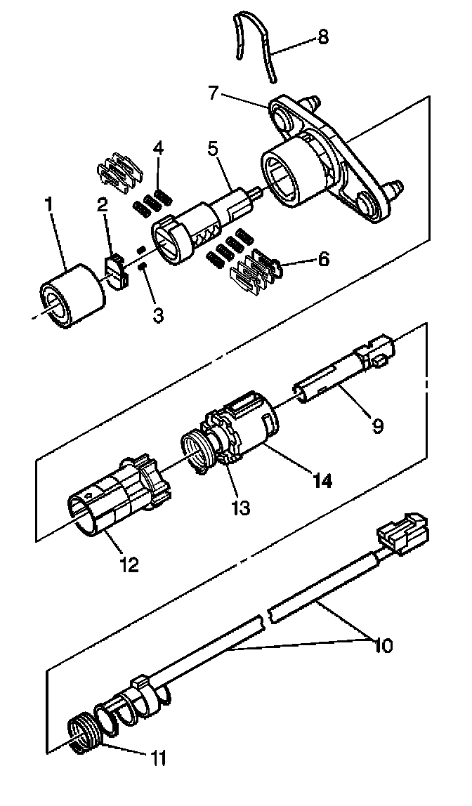 15. Lifting the flat spring and button, install the cylinder (7) into the cylinder housing (6). The retainer bar snaps into place when the cylinder (7) is fully seated.