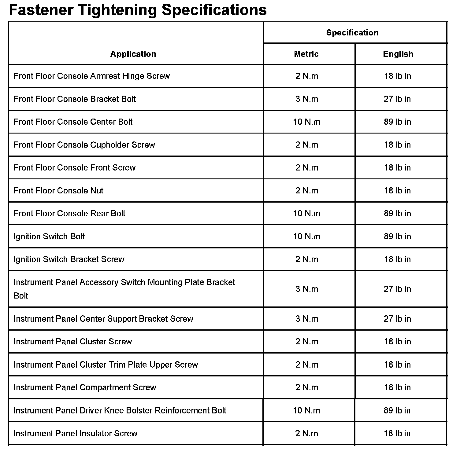 Instrument Panel, Gauges and Warning Indicators: Specifications