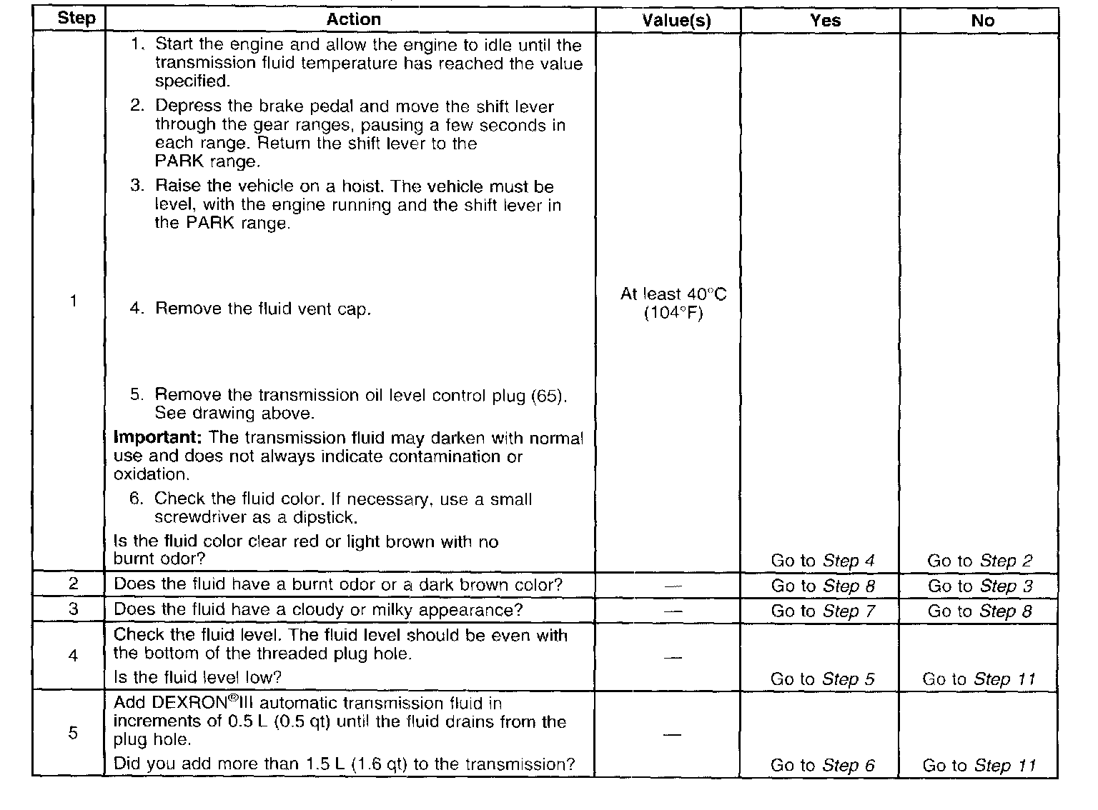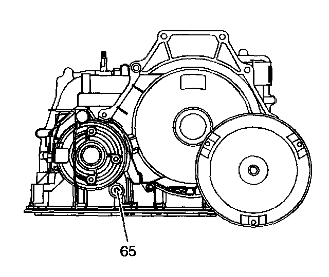 The oil level control plug (65) is located on the torque converter side of the transmission.