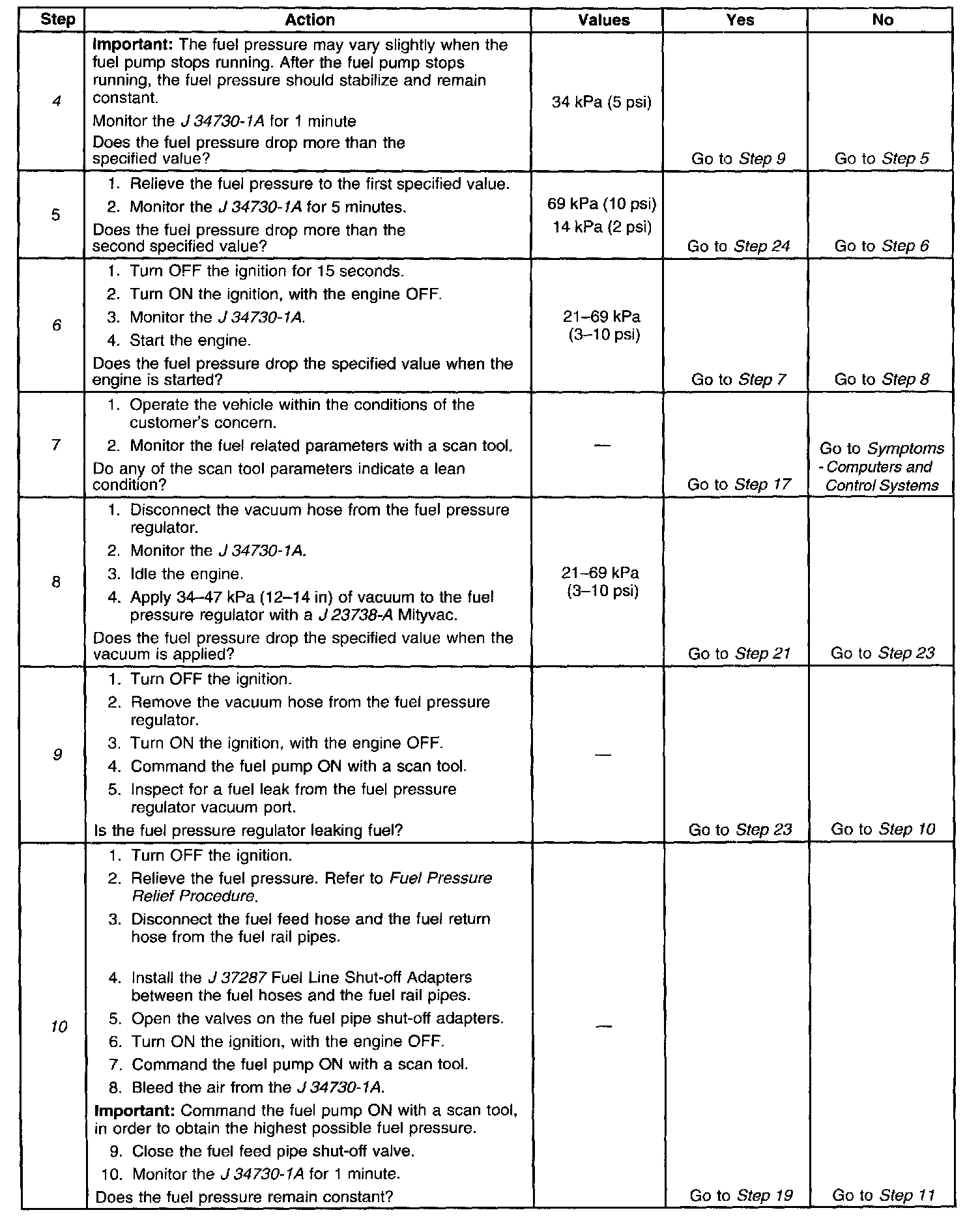 11. This step tests for a leaking fuel injector, or fuel pressure regulator. If the fuel pressure remains constant during this test, the fuel injectors are not leaking fuel.