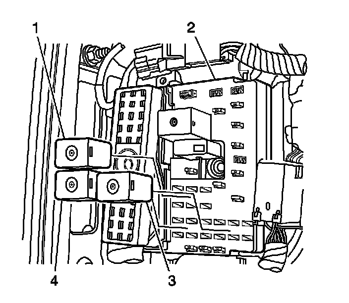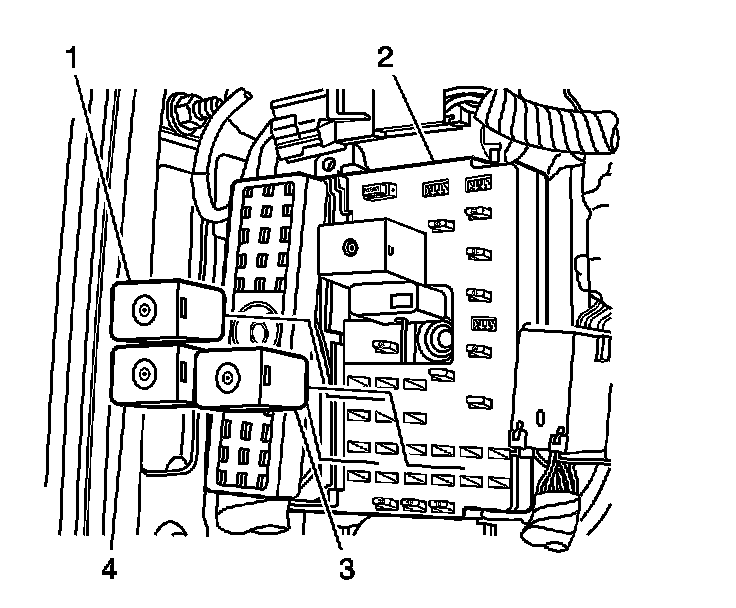 1. Install the relay (1, 3, and or 4) into the I/P wire harness junction block (2).