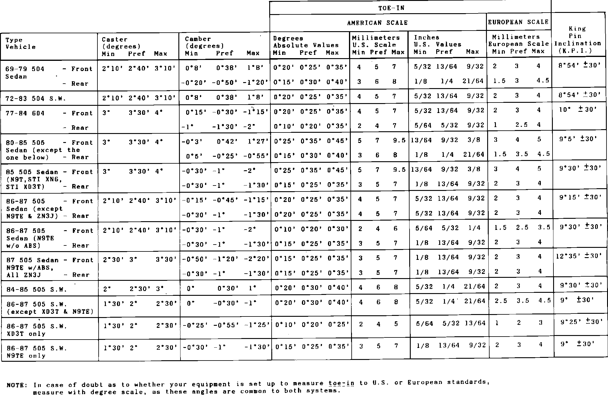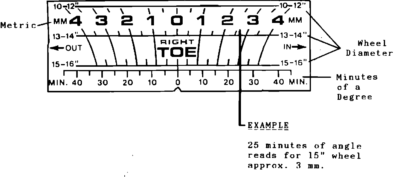 Example: If you measure a correctly adjusted 505 STX for toe-in specification which, according to the Workshop Manual is 3 mm +/- 1 (for a 15" wheel equals 25 minutes) on U.S. equipment, the minute scale will give the true value. However, since most adjustments are made using the more common mm or inch scales, the toe-in would read 5 mm, which the operator would then inadvertently readjust to 3 mm, reducing actual toe-in to less than minimum standards.