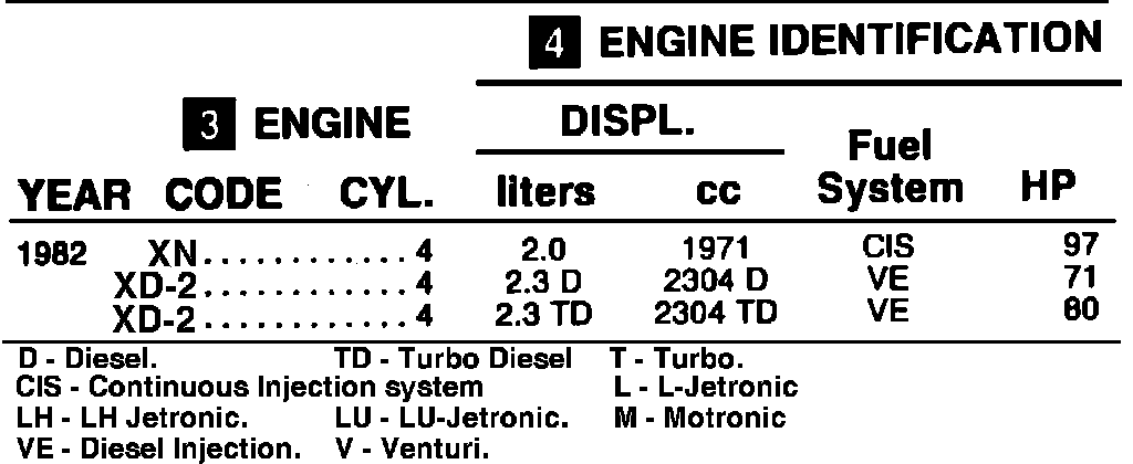 1984-81 - 6th character of VIN. All others - Prefix to engine number, stamped on engine block.