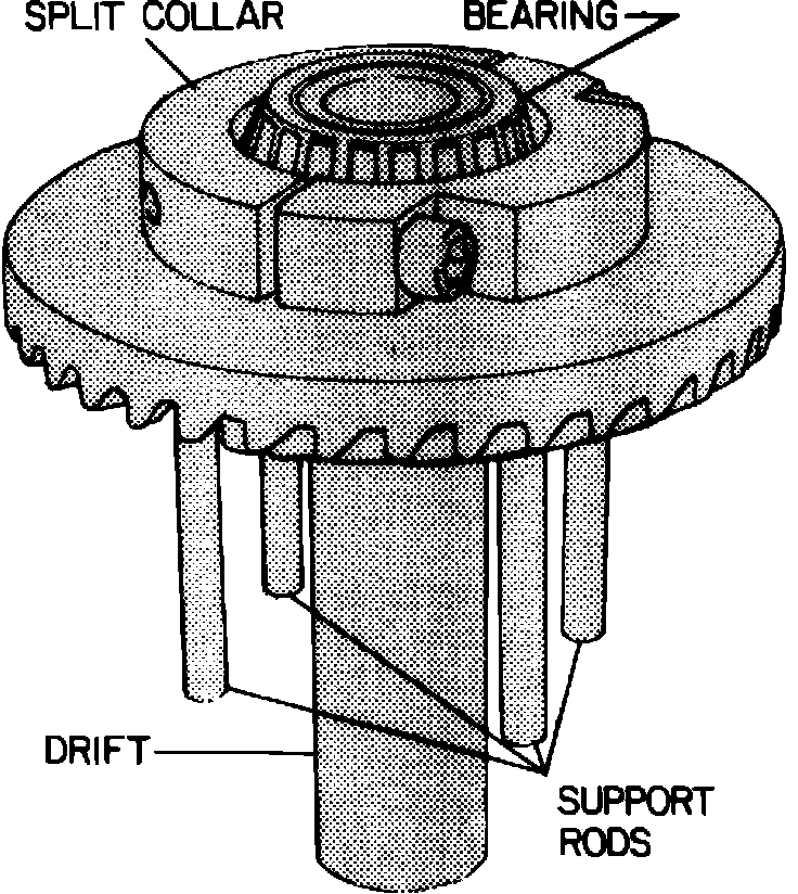 16. Place ring gear on drift, Fig. 2. Insert support rods through 4 opposed holes in the ring gear and position split collar around bearing.