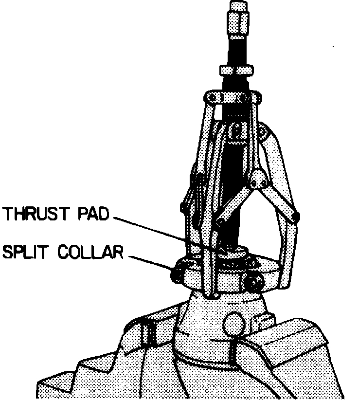 18. Place carrier half of differential in soft-jawed vise and position split collar around bearing, Fig. 3. Place thrust pad on carrier bearing hub.
