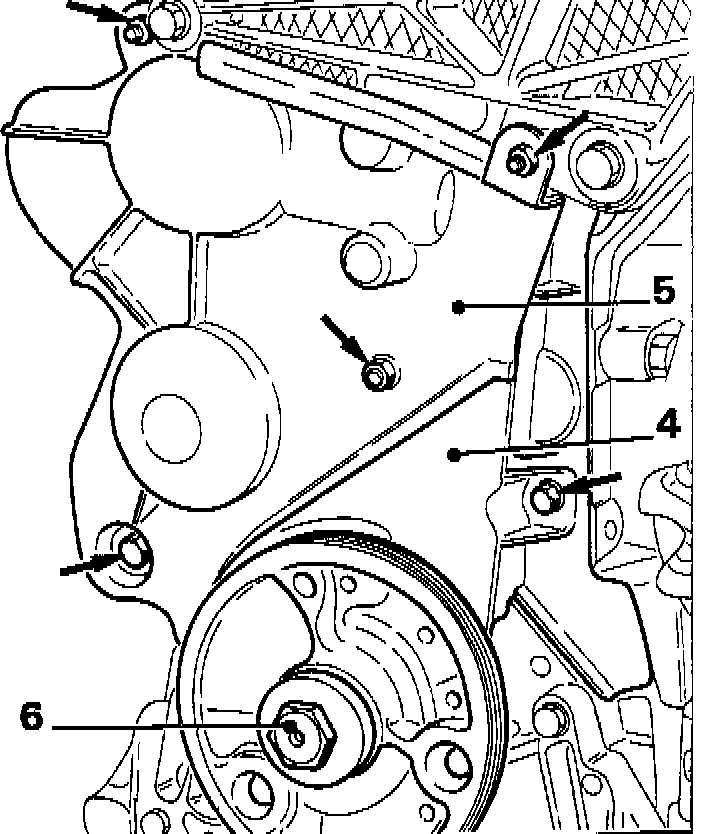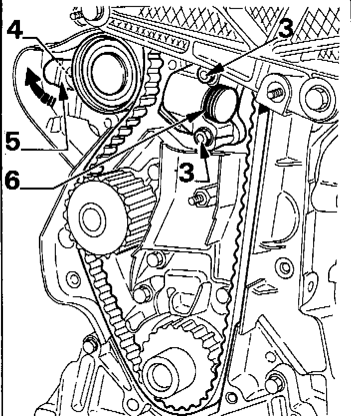 10. Turn tensioner (5) (6 mm square) and position it in such a way that spring (6) is compressed to its maximum (cam in horizontal position)