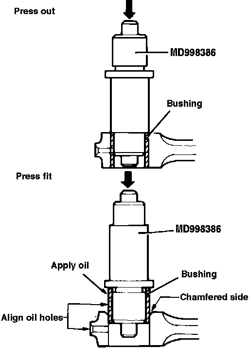 Refer to Fig. 24 and remove parts in numerical order as shown. Number all connecting rods and caps before disassembly so cap can be mated to same rod at reassembly. Use tool No. MD998386 for removal of bushing in connecting rod piston pin end. Use same tool to install new bushing. Make sure oil hole in bushing lines up with oil hole in connecting rod, Fig. 25.