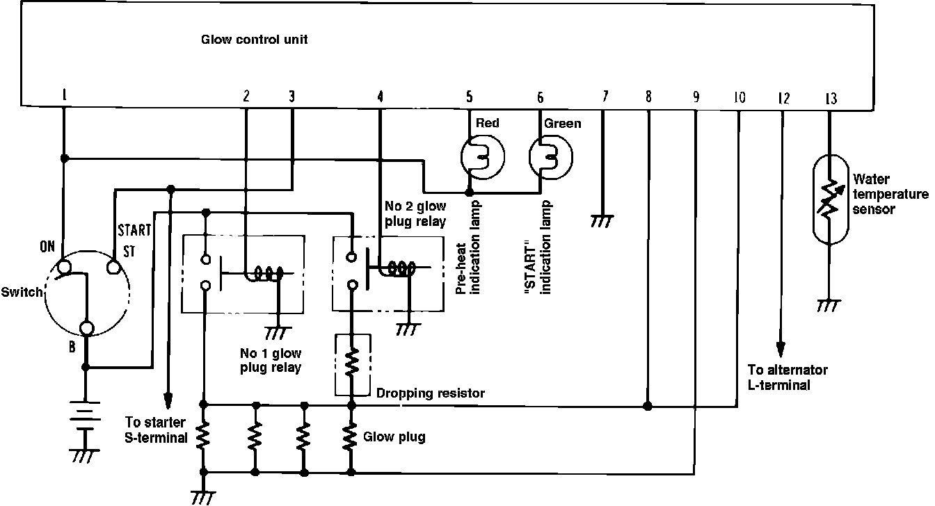 The quick glow system has two main circuits to maintain the glow plug at a constant temperature and to shorten pre-start time. One circuit is used to quickly heat the glow plug by applying battery voltage to the glow plug. The other circuit is used to maintain glow plug temperature after the designed temperature is reached by reducing the voltage applied to the glow plug. The quick glow system will be in operation only when engine coolant temperatures are below 86°F.