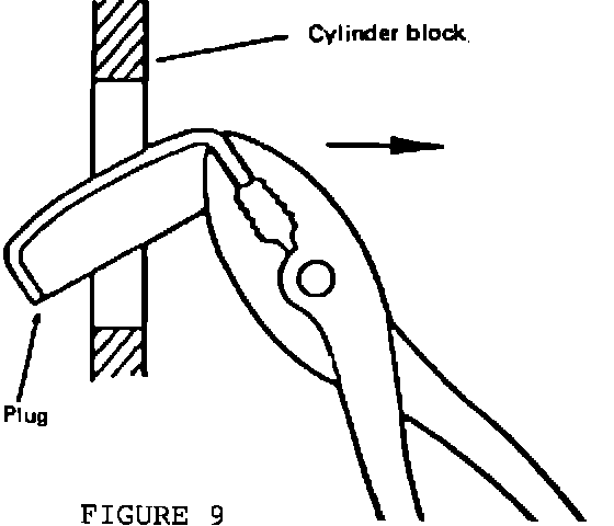 2. To remove the expansion plug, position a blunt punch as shown in Figure 8 and drive the expansion plug inward until it is free. Then, use pliers to remove it from the cylinder block as shown in Figure 9. Clean and deburr the expansion plug hole to prevent damage to the block heater O-ring.
