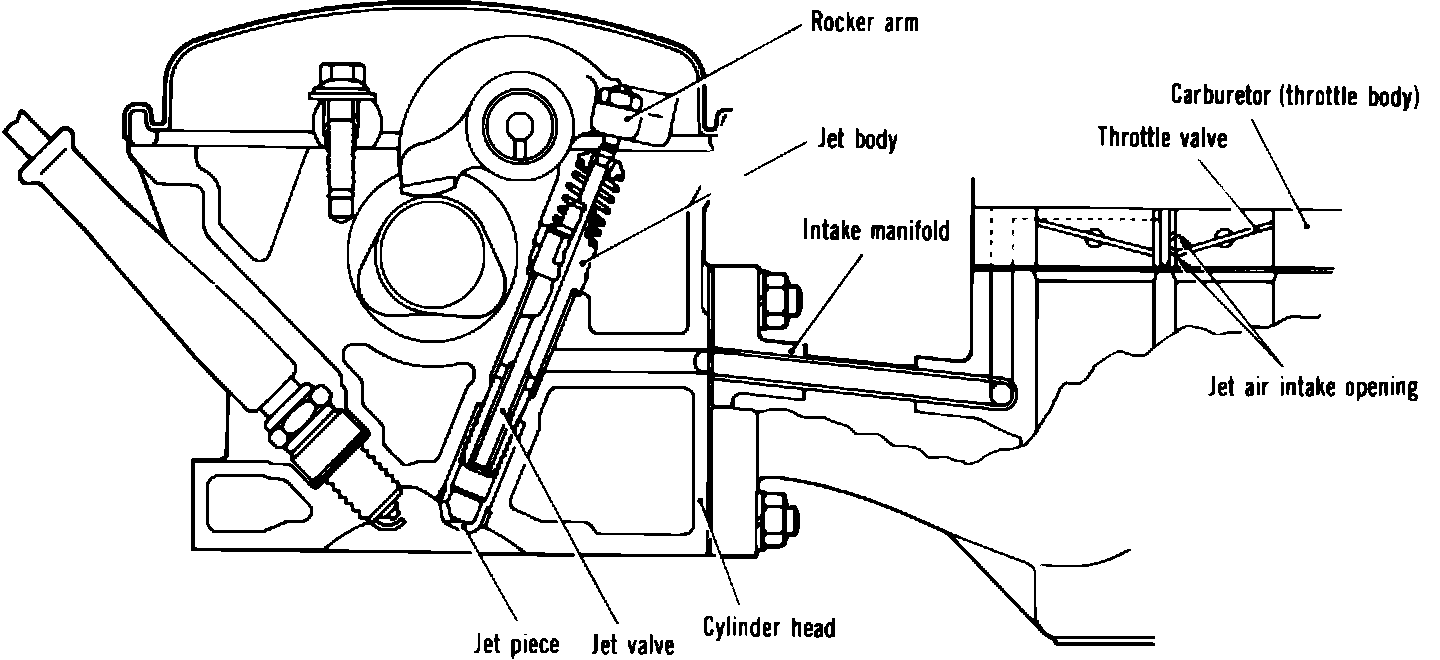 The jet piece is pressed into the cylinder head with the opening in the jet piece facing the spark plug. A jet air passage is provided in the carburetor, intake manifold and cylinder head. The air flow enters the two jet air intake openings on the primary side of the carburetor, one is located above the closed throttle while the other is closed off by the throttle valve at idle speed. When engine is idling or under light throttle applications, the pressure difference between the jet air opening in the carburetor and the combustion chamber during the intake stroke is great, thus causing a high rate of jet airflow to the combustion chamber. As the throttle opening is increased, the pressure differential between the combustion chamber and jet air passage is decreased, causing a reduced jet airflow to the combustion chamber. However, the intensified flow of the normal intake air/fuel mixture satisfactorily provides for efficient combustion.