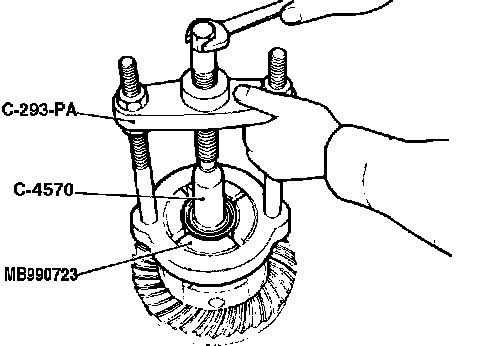 2. Remove side bearing using tool Nos. C-293-pa, C-4570 and MB990723, ensuring to keep adjusting spacers separate to facilitate reassembly.