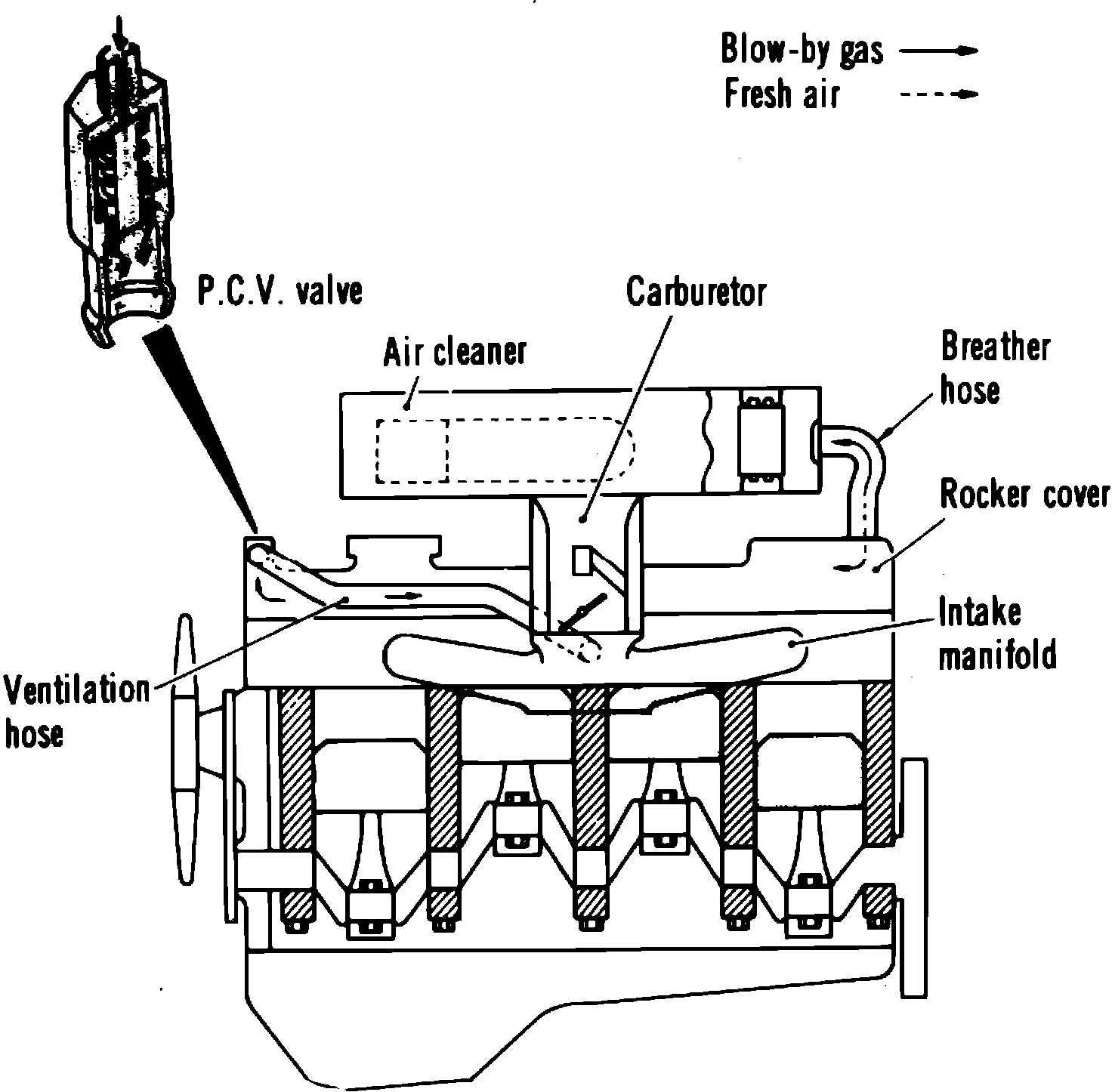 This system incorporates a PCV valve which is located at the rocker arm cover, Fig. 2. With this system, fresh air is routed from the air cleaner to the front of the valve cover and into the crankcase where the fresh air is mixed with the blow-by gasses. The mixture of fresh air and blow-by gasses then passes through the PCV valve and is drawn through a hose to the intake manifold and to the combustion chamber. Under high speed or during acceleration conditions, the blow-by gasses are drawn through the PCV valve to the intake manifold and through the breather to the air cleaner and routed into the combustion chamber.