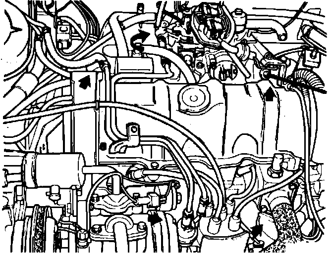 9. Disconnect fuel line, heater hose and the accelerator cable.