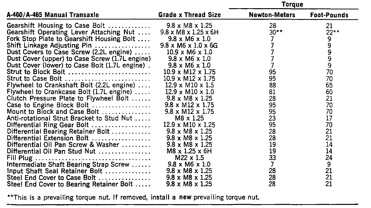 A-460 And A-465 Torque Specifications: