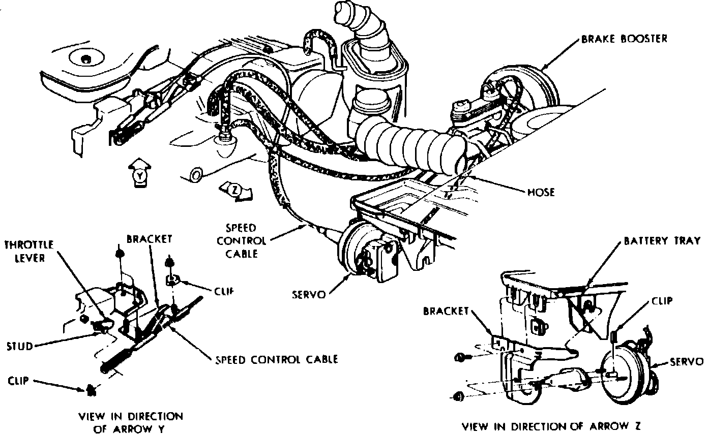 Fig. 19 Speed control cable installation. 1984-85 Mini-Vans/Wagons w/2.6L engine: