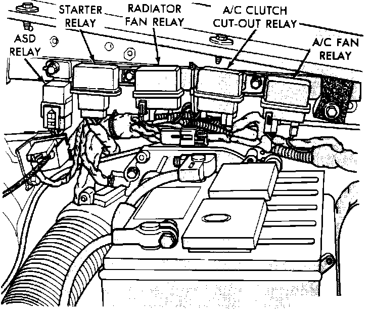 The Auto Shutdown (ASD) Relay is located on the left-hand side of the engine compartment on the inner fender.