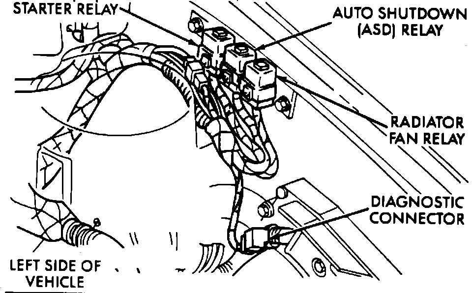 The Auto Shutdown Relay (ASD) is located in the engine compartment on the left inner fender.