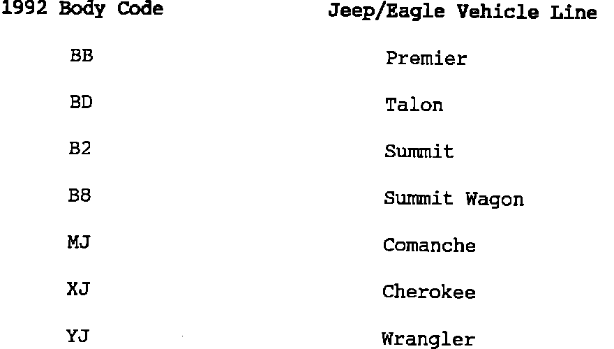 The body codes apply to 1992 vehicles. Please display this information in an area where all affected personnel can make reference to it and become familiar with the body codes.